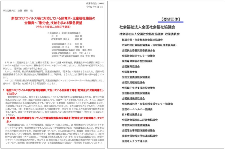 介護業界への慰労金支給の閣議決定直後に、下記の要望書が提出されました。実はこの要望書。保育業界としては大変異例なことです。
