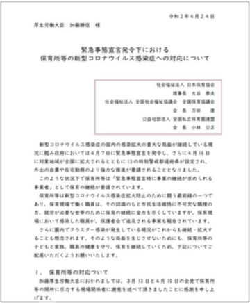 4月24日に提出された要望書は上述の通りで差出名が保育の主要3団体の連名になっています。これが通常のパターンです。