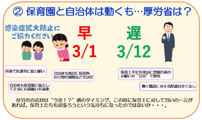 つまり・・・現場で働く職員たちの想いを代弁しなければ、彼ら、彼女たちの行動に報いなければいけないという親心みたいなものです。そしてここで声を挙げなければ今後、このような事態が発生した時に、私たちは“これが当たり前”のように扱われてしまう。ここで声を挙げなければ保育士は他業種に流れてしまい次世代を担う学生たちが保育士を目指さなくなってしまうという業界の危機感をいただいたのです。
