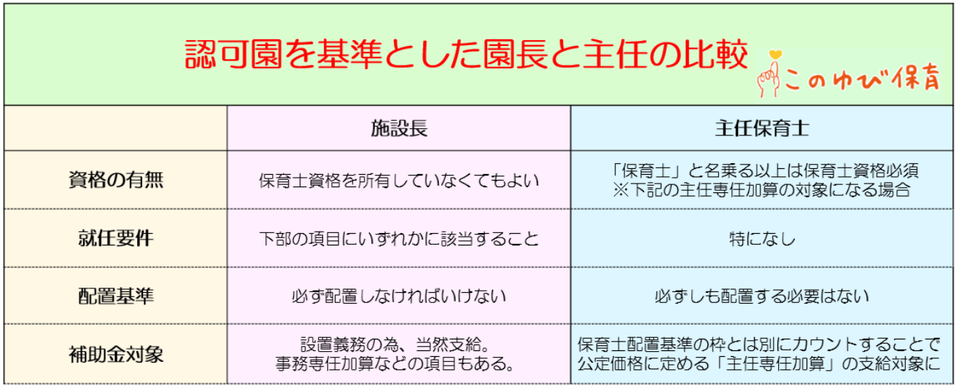 この比較表をもとに解説すると主任保育士は設置義務もなければ就任要件もありません。