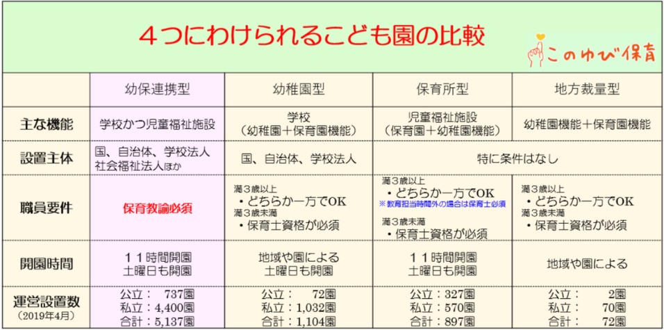 上述の表の通り、幼稚園と保育所の両面を持ち教育と保育を行う幼保連携型認定こども園が最多です。幼保連携型こども園で働く有資格者は、全員「保育教諭」です。この幼保連携型こども園の求人票には「保育教諭」や「保育士資格と幼稚園教諭の両方を持っている方」という記載が多くみられます。