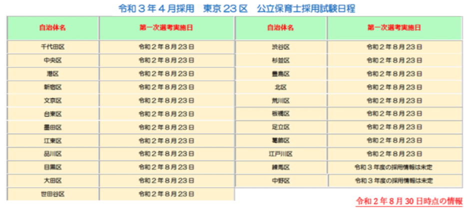 まず下記の保育士採用試験の日程表に注目してください。これは令和2年度の東京23区で実施された第一次試験日程です。