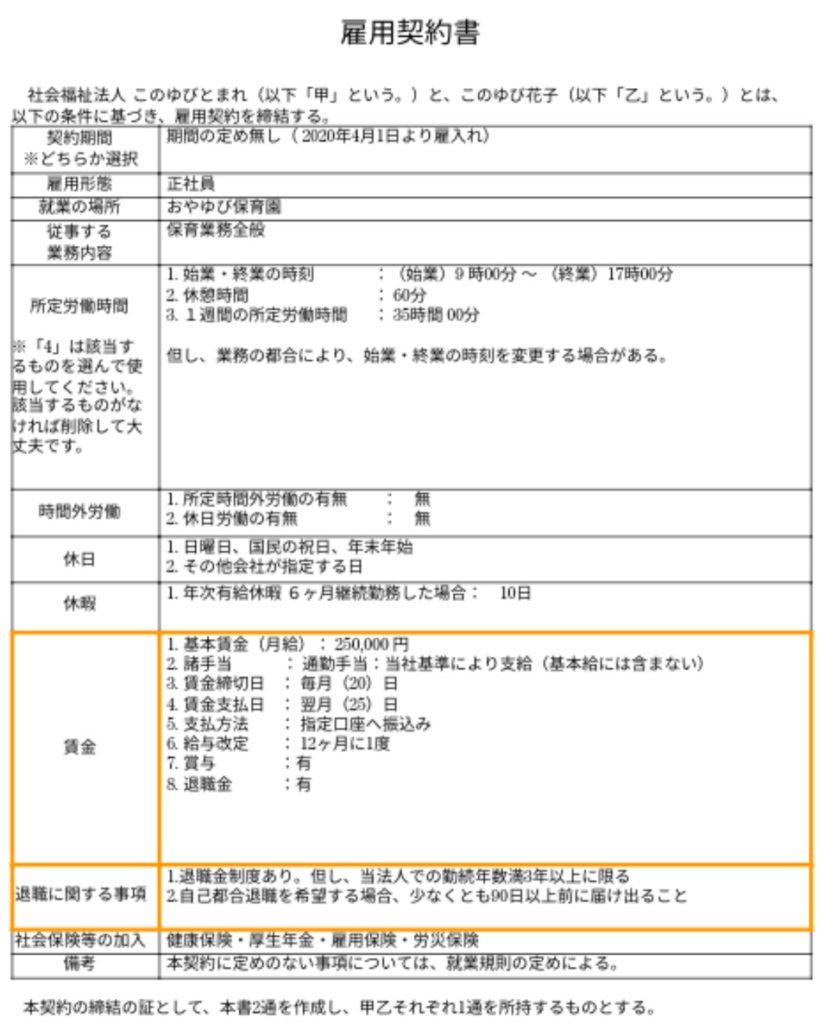 雇用契約書は、入社前に受け取る資料です。雇用契約書のサンプルを下記に掲載します。 オレンジ色の部分が、見るべき項目です。