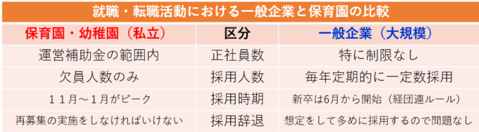 ではどうして保育業界においてはこのような指導があるのか。それは「保育園」「幼稚園」ならではの特徴が理由になっています。わかりやすく下記の比較表をもとに説明していきましょう。