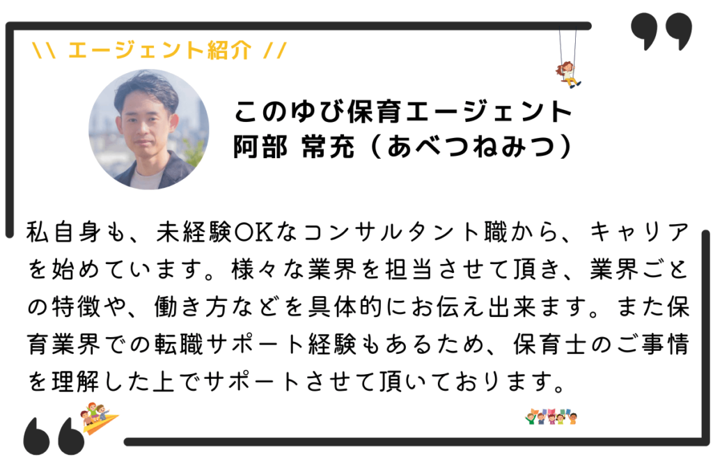 このゆび保育のコンサルタントが担当します。当社のコンサルタントは、求職者様への面談対応から、企業への営業活動まで一貫して行っております。また、一般業界での業務経験が10年以上あるため、実際の働き方や、業界の特徴などもお伝え出来ます。