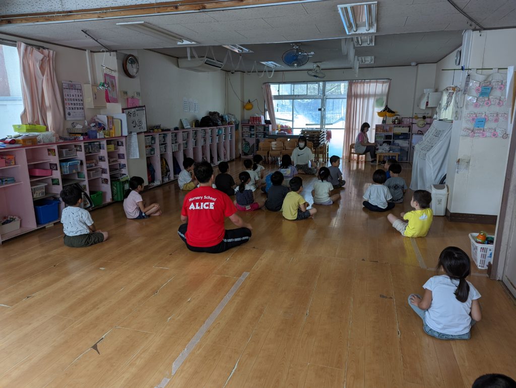その他にも、幼児クラスで行っているマラソンでは、手を繋いでワイワイ走ったり、新幹線やハヤブサになりきって走ったりと自然と体力作り、暑さに負けない体作りに繋げています。また、何もなかったテラスには人工芝を敷いていったり、2階で過ごす0,1,2歳児にも植物に触れられるようにゴーヤなどを育てていたり、肥料つくりをしていたり、この数年の中で環境を整えきた、保育園アリスならではの大事にしているものが垣間見えた気がします。