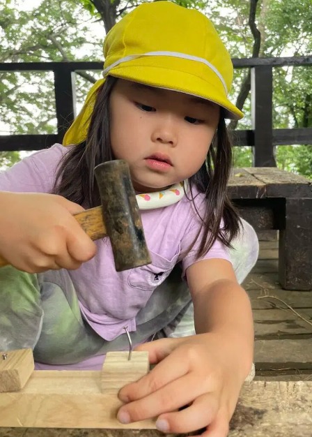 近所の公園ではプレイパークがあり、焚き火をしたり、ノコギリや金槌を使って木工遊びもできます。あと、雨の日も散歩に行って、天気を感じたり、思いっきり水溜りで遊んだりしています。