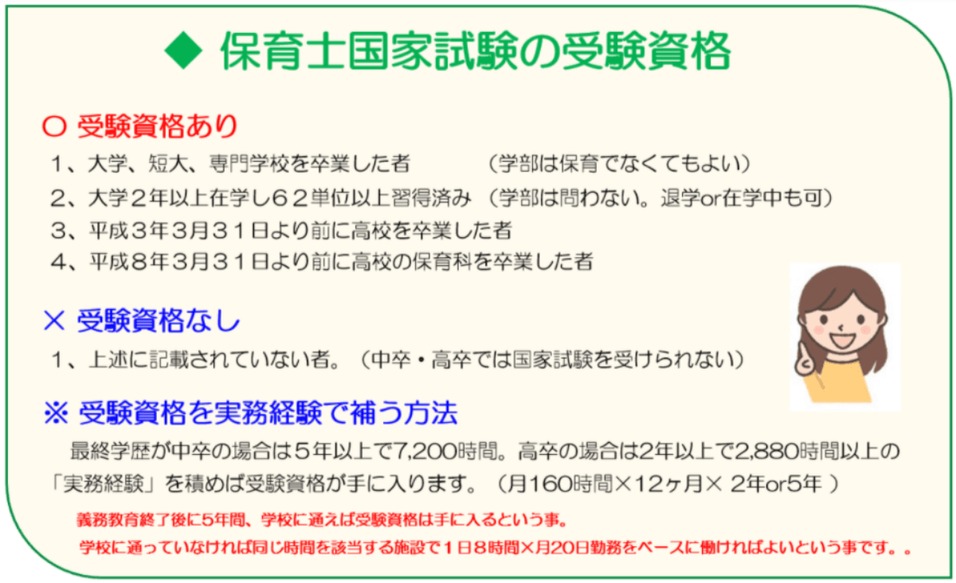 最終学歴が義務教育+5年間の進学経験であれば、保育士国家試験に合格することで保育士として働くことができます。合格率は、約20%と5人に1人が合格しています。