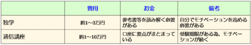 試験勉強のためには、「通信講座」「独学」の方法があります。それぞれの特徴を下記に記載します。